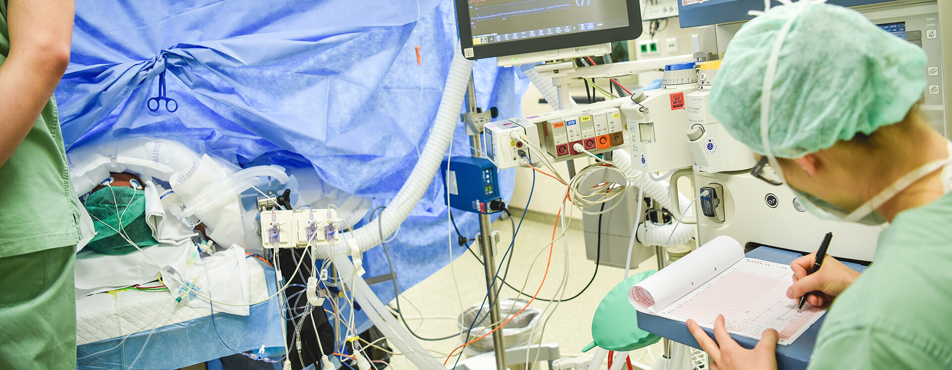Während einer Narkose behalten wir alle lebenswichtigen Organfunktionen im Blick: Neben der Kontrolle der Atmung durch das Beatmungsgerät werden die Herzfrequenz mit einem EKG, die Sauerstoffsättigung im Blut mit einem Fingerclip und der Blutdruck mittels Blutdruckmanschette (meist am Oberarm) kontinuierlich überwacht. Bei größeren Eingriffen ist meist eine intensivere Überwachung der Funktion von Herz und Kreislauf, zum Beispiel durch eine Messsonde in der Handschlagader (Arteria radialis), notwendig.