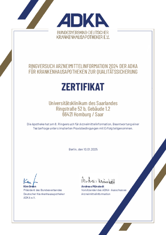 Unsere Arzneimittelinformationsstelle unterzieht sich jährlich der externen Qualitätskontrolle unseres Berufsverbandes und ist entsprechend zertifiziert.