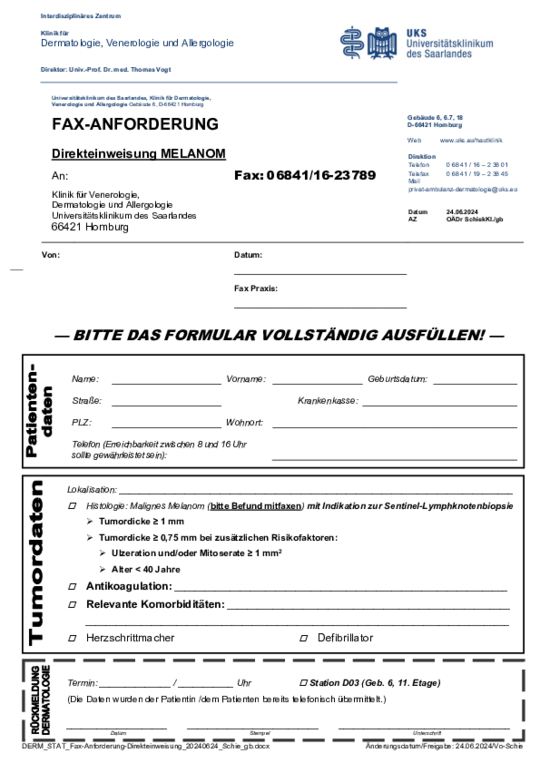Bitte verwenden Sie das Formblatt Direkteinweisung Melanom und faxen Sie es zusammen mit dem histologischen Befund an +49 6841 16-23789. Wir kümmern uns um einen Termin für die Patientin oder den Patienten und bestellen sie oder ihn entsprechend ein. Der Umweg über die Allgemeine Ambulanz entfällt, und das operative Verfahren kann direkt eingeleitet werden.