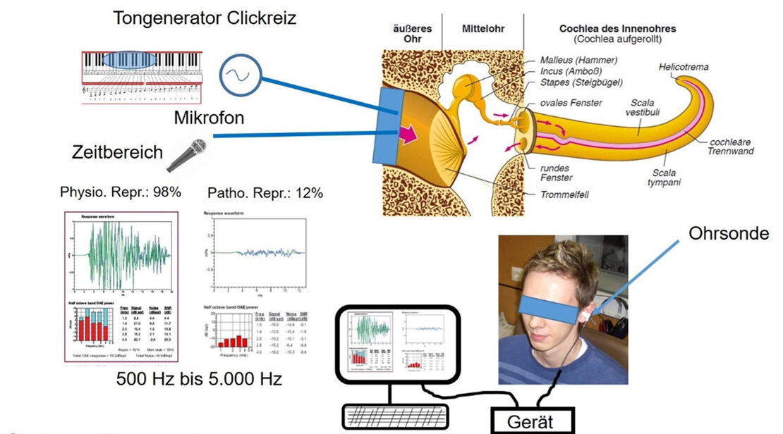 Neben diesen subjektiven Tests gibt es auch objektive Verfahren, die keine aktive Mitarbeit der Patientin oder des Patienten erfordern. Eine solche Methode ist die Messung der otoakustischen Emissionen (OAE). Dabei werden leise Töne in das Ohr gesendet und die Antwort der äußeren Haarzellen - also quasi das Echo – gemessen.