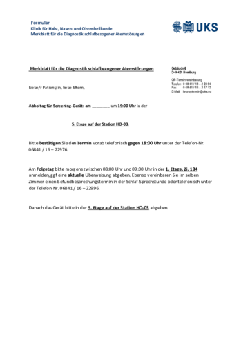 Wenn Sie schnarchen oder bei Ihnen Atempausen während des Schlafes beobachtet wurde, lassen Sie sich bitte von Ihrer Hausärztin oder Ihrem Hausarzt, Ihrer Internistin oder Ihrem Internisten, HNO-Ärztin oder HNO-Arzt eine Überweisung in die HNO-Klinik ausstellen. Vereinbaren Sie dann einen Termin in der Schlaflaborsprechstunde: