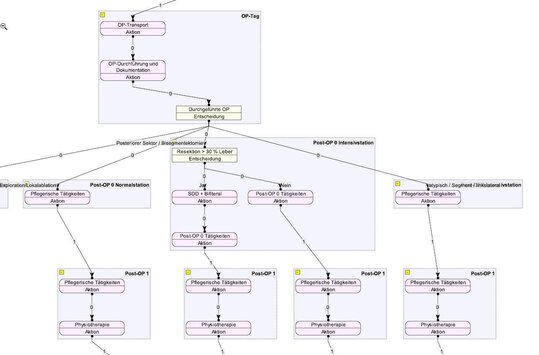 Nachfolgend sehen Sie zwei Beispiele, wie die Informationen zu einem klinischen Behandlungspfad innerhalb des KIS aussehen. Neben der graphischen Darstellung zeigt die nächste Abbildung auch, wie die einzelnen Schritte zeitnah erfasst und dokumentiert werden. Mit dem Modul i.s.h.med pathways der Fa. Siemens (ehemals GSD) aus Berlin erstellen wir alle klinischen Behandlungspfade und hinterlegen dort alle medizinisch relevanten Informationen.