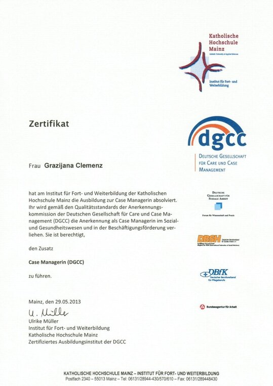 Seit Mai 2013 steht nach erfolgreichem Abschluss ein bei der Deutschen Gesellschaft für Care und Case Management (DGCC) zertifiziertes Case Management zur Verfügung. Hierdurch wurde ein wesentlicher Baustein zur Verbesserung der Patientenversorgung hinzugefügt.