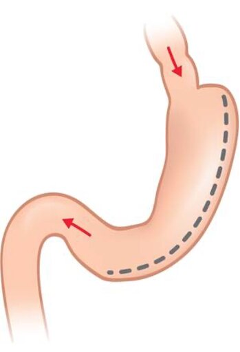 Die Schlauchmagenoperation ist neben dem Roux-Y-Magenbypass eine der Standardoperationen in der Adipositaschirurgie. Bei der Schlauchmagenoperation werden 90% des Magenvolumens entfernt, so dass der Magen am Ende der Operation ein Volumen von ca. 70 ml fasst. Der abgetrennte Magen wird aus dem Bauchraum entfernt und das Volumen gemessen. Ab einem entfernten Volumen von mindestens 500 ml tritt der Effekt der Gewichtsreduktion ein. Die Operation gehört zu den restriktiven Verfahren (Magenverkleinerung) in der Adipositaschirurgie, wirkt jedoch auch hormonell über die Reduktion des Hormons Ghrelin (Hungerhormon). Durch die Magenverkleinerung wird das Sättigungsgefühl schon nach kleinen Mengen an Nahrung erreicht, durch die fehlende Ghrelinproduktion bleibt ein neu auftretendes Hungergefühl aus. Eine parallele Änderung des Essverhaltens und daraus resultierend des Lebensstils ist wie bei jedem adipositaschirurgischen Eingriff für den Erfolg erforderlich. Eine lebenslange Vitaminsubstitution sollte nach der Operation erfolgen. Im Speziellen sollte Vitamin B12 regelmäßig substituiert werden, um Mangelerscheinungen vorzubeugen. Die Schlauchmagenbildung wird laparoskopisch, d.h. über 4-5 Einstiche in der Bauchdecke durchgeführt. Vor der Operation ist eine vierwöchige Flüssigkostphase einzuhalten. Es ist wissenschaftlich nachgewiesen, dass es hierdurch zu einer Verbesserung der verschiedenen Organfunktionen kommt, was die Grundlage für einen erfolgreichen und sicheren Operationsverlauf ist. Zudem führt eine präoperative Gewichtsreduktion von ca. 5% des Körpergewichts zu einer besseren langfristigen Gewichtsabnahme. Die Operation kann bei jedem morbid adipösen Patienten, unabhängig von Alter, BMI und Begleiterkrankungen durchgeführt werden. Bei Patienten mit einem extrem hohen BMI (BMI > 60 kg/m2) ist es manchmal primär erforderlich eine konservative Therapie zur Gewichtsreduktion unter stationären Bedingungen durchzuführen, um das Operationsrisiko zu minimieren. In besonderen Fällen wird im Anschluss an die Schlauchmagenoperation ein malabsorptives Verfahren (Magenbypass oder biliopankreatische Diversion) durchgeführt.