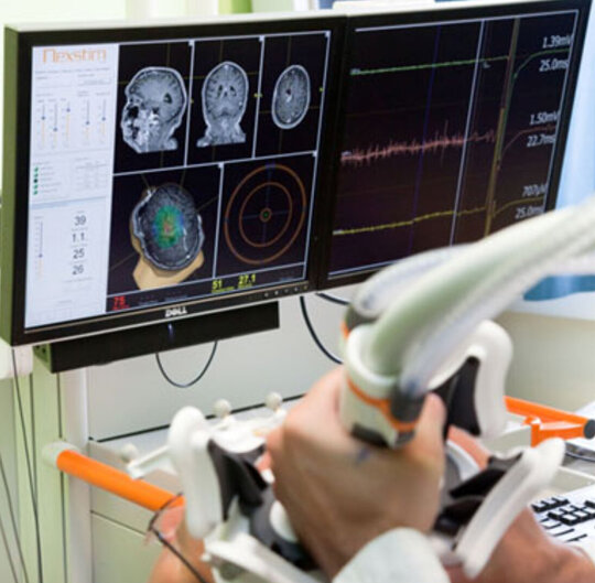 Die navigierte Transkranielle Magnetstimulation (nTMS) wird präoperativ zur Lokalisation wichtiger Hirnregionen wie Sprach- oder Motorareal angewandt. Physikalische Grundlage hierfür ist eine Aktivierung oder Hemmung von Nervenzellen durch magnetische Impulse.