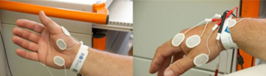 4. Zur Registrierung der Muskelaktivierung (Motorisch evozierte Potentiale; MEPs) werden Ableitelektroden auf die zu untersuchenden Muskeln geklebt. Diese registrieren kontinuierlich die Muskelaktivität (hier die Handmuskulatur).