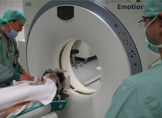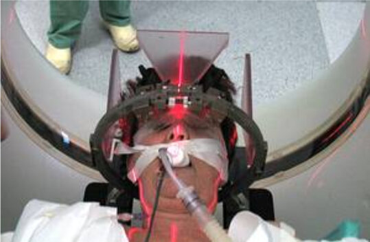 In der Stereotaxie geht es darum, Kanülen oder Elektroden in tief liegende kleine Hirnstrukturen entlang eines geraden Weges mit hoher Präzision einzuführen. Der erforderliche Zielpunkt wird aus CT/ MR Schichtbildern des Patienten ermittelt und mit Hilfe eines mechanisch präzisen Apparates exakt erreicht.