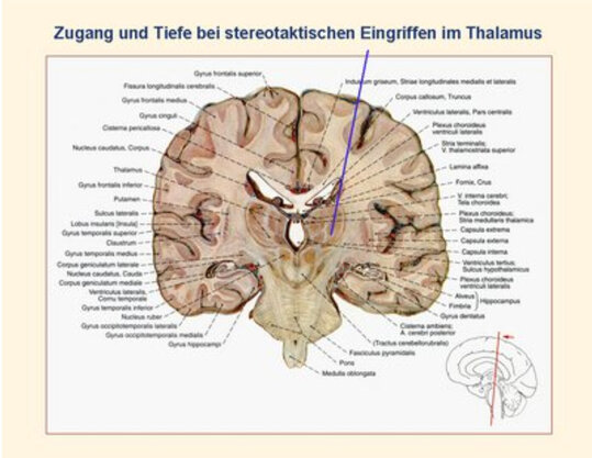 Die Zielstrukturen hängen von der Art der Erkrankung ab. Ein wichtiger Zielpunkt zur Behandlung des reinen Zitterns (Tremor) ist der VIM Kern (Ncl. ventralis intermedius) des Thalamus. Die blaue Linie in Abbildung 7 zeigt den Zugang und die Spitze den Zielpunkt im VIM Kern des Thalamus in einem frontal Hirnschnitt. Wenn bei Morbus Parkinson neben dem Tremor auch Steifigkeit (Rigor), unkontrollierte Bewegungen (Hyperkinesen) oder Bewegungseinschränkung (Akinese) vorliegen, denn werden alle diese Symptome am wirkungsvollsten in einem kleinen Kern zwischen dem Thalamus und dem Mittelhirn ausgeschaltet, dem sog. STN (Ncl. subthalamicus).