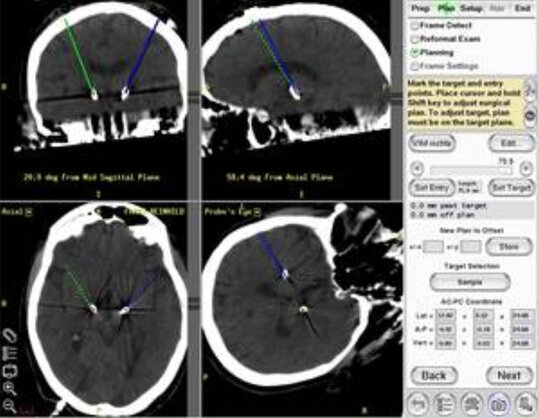 Einige Tage vor der Operation wird anhand aktueller Kernspinbilder (MR) die Planung durchgeführt. Bei Morbus Parkinson müssen typischerweise beidseitig Elektroden in den Nukleus subthalamicus (STN) eingeführt werden. Die Software ermöglicht den Zielpunkt im STN in den entsprechenden Schichten darzustellen und den Zugang so zu planen, dass man Verletzung von Gefäßen oder wichtigen Hirnstrukturen vermeidet.