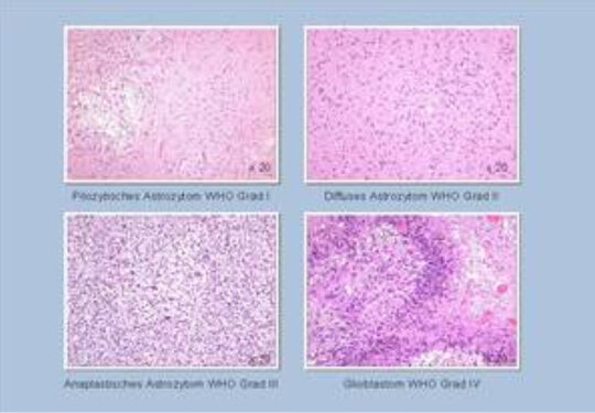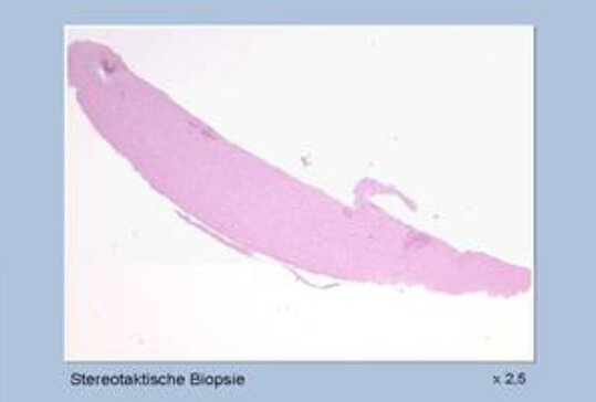 Im Operationssaal wird der aufgesetzte stereotaktische Ring mit dem Patienten am Operationstisch befestigt. Am Phantom wird die Lage und das Erreichen der geplanten Entnahmestelle kontrolliert. Danach wird der Zielbügel auf den Patientenring übertragen. Nach Eröffnung des Schädels über ein kleines Bohrloch wird die Biopsiekanüle eingeführt. Die Kanüle ist gewölbt und nicht spitz, sodass sie beim Vorschieben das Gehirngewebe und Gefäße verdrängt aber nicht verletzt. Anschließend werden mehrere Proben aus unterschiedlicher Tiefe entlang des Kanülenweges durch den Tumor entnommen, um sich ein repräsentatives Bild über den feingeweblichen Aufbau des pathologischen Prozesses zu machen. Abbildung 5 zeigt einen Biopsiezylinder von etwa 8 mm Länge. Die Proben werden während der Operation von dem Neuropathologen untersucht und dieser erstellt eine vorläufige Diagnose. Sobald ausreichend repräsentatives Material entnommen wurde, wird die Nadel zurückgezogen und die Operation beendet. Am häufigsten handelt es sich bei der Biopsie um hirneigene Tumore sogenannte Gliome von unterschiedlicher Gutartigkeit. Typischerweise nimmt die Bösartigkeit mit wachsenden Zellzahl und Zelldichte zu. Abbildung 6 zeigt links oben die zellarme gutartige und rechts unten die bösartige zellreiche Form eines Glioms. Die endgültige Diagnose mit speziellen Färbemethoden erfordert etwa 1 Woche. Üblicherweise können die Patienten ein Tag nach der Biopsie mobilisiert werden und nach wenigen Tagen bis zum Eintreffen der endgültigen Diagnose nach Hause entlassen werden.