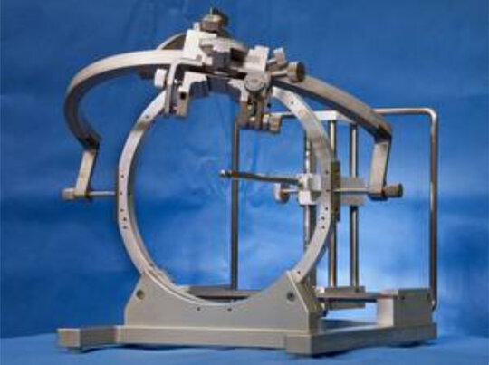 1. Grundring: Dieser wird unverrückbar (in Narkose) am Schädel des Patienten befestigt. Er stellt ein festes Bezugsystem in alle 3 Richtungen des Raumes dar. (Abb.1).