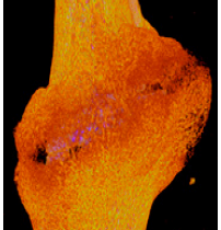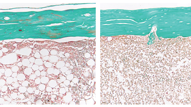Aufgrund der steigenden Altersstruktur und veränderten Lebensweise der westlichen Bevölkerung mit mangelnder Bewegung und kalorienreicher Ernährung ist ein drastischer Anstieg der sogenannten „Volkskrankheiten“ zu verzeichnen. Vor allem das Alter ist nicht nur mit einem deutlichen Knochenverlust (Osteoporose) und einem erhöhten Frakturrisiko verbunden, sondern beeinträchtigt auch die Phasen der Knochenheilung, so dass die Regenerationsfähigkeit deutlich abnimmt. Die Folge ist eine verzögerte oder gar ausbleibende Heilung. Damit verbunden sind vielfache operative Eingriffe am Knochen mit einer langen Hospitalisierung der Patienten. Ein Schwerpunkt unserer Arbeitsgruppe ist deshalb die Untersuchung der Frakturheilung im Alter sowie die Untersuchung des Frakturheilungsprozesses bei Stoffwechselerkrankungen. Interessanterweise konnten Studien bei adipösen Mäusen zeigen, dass trotz deutlich erhöhtem Fettanteil im Knochen (siehe unten) bei signifikant erhöhten Konzentrationen von Leptin im Blut weder in der biomechanischen Testung noch in den histologischen Untersuchungen signifikante Unterschiede in der Knochenheilung nachzuweisen sind. In Western Blot-Untersuchungen zeigte sich jedoch eine verminderte Expression von osteogenen Wachstumsfaktoren. Des Weiteren war das antioxidative Potential im Frakturkallus der adipösen Mäuse deutlich erniedrigt.
