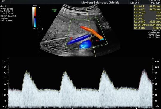 Ultraschalluntersuchung der mütterlichen und kindlichen Durchblutung (Farb-Dopplersonografie)