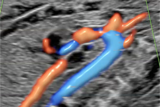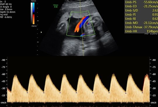 Die Durchblutung der Nabelschnur, der kindlichen Gefäße und des Mutterkuchens wird mittels einer speziellen Ultraschalltechnik durchgeführt. Mit der sogenannten (Farb-)Dopplersonografie können wir in der Pränataldiagnostik und Schwangerenambulanz die Versorgungslage überprüfen.