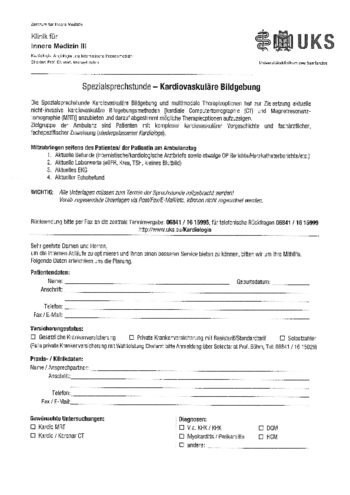Die Spezialsprechstunde gehört zur Klinik für Innere Medizin III am Universitätsklinikum des Saarlandes (UKS). In unserer Bildgebungsambulanz bieten wir in enger Zusammenarbeit mit der Klinik für Diagnostische Interventionelle Radiologie umfassende Untersuchungen zur kardiovaskulären Gesundheit an. Dazu gehören die Kernspintomographie des Herzens (Kardiales MRT) sowie die Computertomographie des Herzens (Kardio-CT). Für die Anmeldung nutzen Sie bitte den Anmeldebogen.