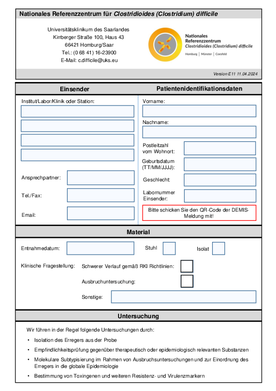 Das NRZ bittet weiterhin um die Einsendung von Isolaten oder Stuhlproben, insbesondere bei Ausbrüchen oder meldepflichtigen schweren C. difficile-Fällen. Stuhlproben können auch nach Beginn einer Therapie entnommen und eingesandt werden.