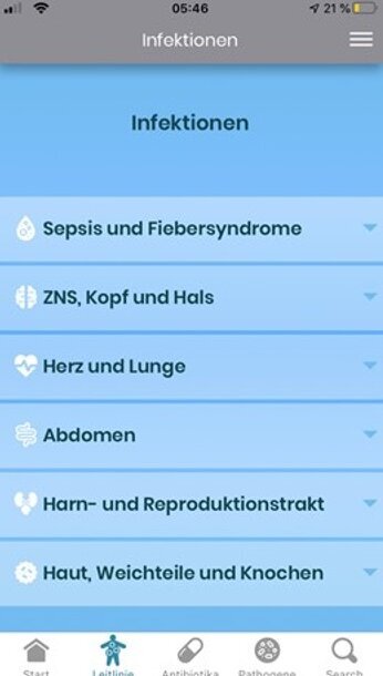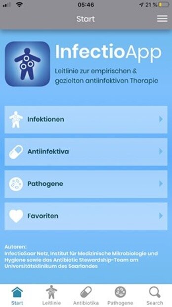 Die InfectioApp ist eine Antibiotika-Leitlinie zur empirischen und gezielten Therapie häufiger Infektionen, welche am UKS entwickelt wurde. Es handelt sich um eine Smartphone-App, die komplett kostenfrei ist und Ihnen im klinischen Alltag schnell und zuverlässig Informationen zu Infektionen sämtlicher Organsysteme zur Verfügung stellt. Die App wurde von der interdisziplinären Antibiotic-Stewardship-Gruppe des UKS inhaltlich erstellt und wird fortlaufend aktualisiert. Dabei ist sie auch offline auf mobilen Endgeräten verfügbar und ermöglicht über eine Suchfunktion, dass alle relevanten Informationen schnell und unkompliziert gefunden werden können.