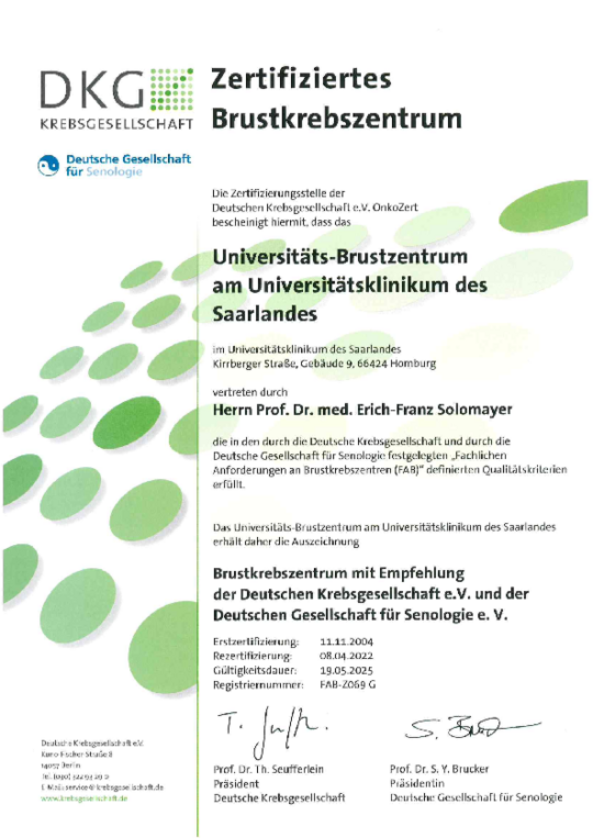 Das Universitäts-Brustzentrum am UKS wurde von der Deutschen Gesellschaft für Senologie und der Deutschen Krebsgesellschaft erstmals im Jahr 2000 zertifiziert. Dieses Zertifikat garantiert eine qualitätsgesicherte und leitlinienorientierte Versorgung bei Brusterkrankungen und wird jährlich überprüft. Aufgrund unserer guten Patientenversorgung wurden wir mehrmals in die FOCUS-Klinikliste der besten Versorgungszentren aufgenommen.