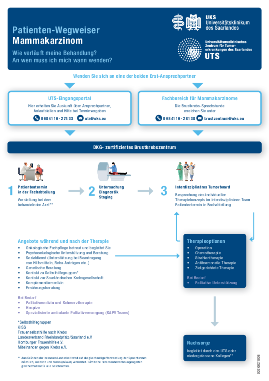 Im Brustkrebszentrum des UKS legen wir großen Wert auf eine umfassende Betreuung und Zusammenarbeit. In Kooperation mit dem Universitätsmedizinischen Zentrum für Tumorerkrankungen (UTS) bieten wir Ihnen regelmäßig Patienten-Infoveranstaltungen zu verschiedenen Krebsthemen an. Diese Veranstaltungen sind eine wertvolle Möglichkeit, sich über neueste Entwicklungen und Behandlungsmöglichkeiten zu informieren. Schauen Sie doch einmal in die Veranstaltungsübersicht und nehmen Sie teil – es lohnt sich!
