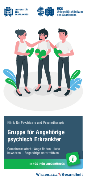 Im Rahmen einer 14-tägig stattfindenden Angehörigengruppe bietet die Klinik für Psychiatrie und Psychotherapie des Universitätsklinikums des Saarlandes allen Angehörigen psychisch kranker Menschen wichtige Informationen und eine niedrigschwellige Möglichkeit des Austauschs. In der ärztlich und psychologisch geleiteten Gruppe werden Fragen zu verschiedenen psychischen Erkrankungen, den jeweiligen Behandlungsmöglichkeiten und der Rückfallprävention beantwortet. Ein weiterer Schwerpunkt ist die Vermittlung von Hilfen im richtigen Umgang mit psychisch Erkrankten und der Erwerb förderlicher Bewältigungsstrategien und Entlastungsmöglichkeiten. Als besonders hilfreich wird dabei der direkte Erfahrungsaustausch unter den teilnehmenden Angehörigen erlebt.
