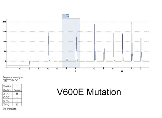 Mittels Sequenzierung (Pyrosequencing) wird der DNA-Abschnitt des BRAF-Gens, welcher zum Aminosäureaustausch an Position 600 führen kann, auf Punktmutationen analysiert (s. Abbildung). Mit Abstand am häufigsten kommt die V600E-Mutation bei Hirntumoren vor (der Austausch der Aminosäure Valin durch Glutamat); weitaus seltener sind V600D-, V600K- und V600R-Mutationen.