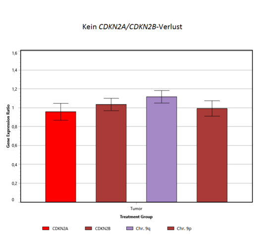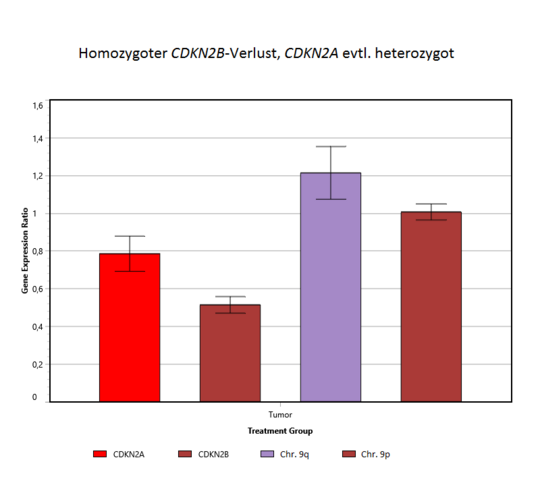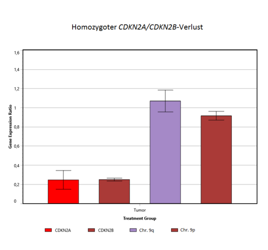 Die Bestimmung des CDKN2A- und CDKN2B-Status erfolgt mittels quantitativer PCR. Mit Hilfe von Vollblut-DNA oder Referenzgewebe-DNA und nicht-betroffenen Referenzgenloki lassen sich so Kopienzahlveränderungen im Tumor feststellen [5,6]. Sowohl in der Referenz-DNA als auch in der Tumor-DNA werden die Cq-Werte (ein quantitatives Maß für das Vorhandensein des Genabschnittes) der Gene CDKN2A, CDKN2B (Chromosom 9p21.3), zwei weiterer Gene auf 9p und 9q, sowie von β-Actin und B2M ermittelt. Die letzteren beiden (β-Actin und B2M) dienen dabei als probeninterne Referenzen (ΔCq zwischen Gene of Interest und Reference Gene), um Qualitäts- und Mengenunterschiede der DNA herausrechnen zu können. Für mögliche heterozygote oder homozygote Deletionen, hervorgerufen durch somatische Veränderungen im Tumor (die nicht im Blut vorhanden sind), wird die Differenz der Cq-Werte zwischen Tumor- und Blutprobe bestimmt (ΔΔCq). Liegt das relative Verhältnis der CDKN2-Gene in Tumor/Blut etwa um 1,0, liegt kein Verlust vor. Liegt der Wert darunter, kann – je nach Tumorzellanteil – eine heterozygote oder homozygote CDKN2A/2B-Deletion vorliegen. Mit Hilfe weiterer Gene auf Chromosom 9 wird beurteilt, ob es sich um punktuelle Deletionen oder um größere chromosomale Verluste handelt.