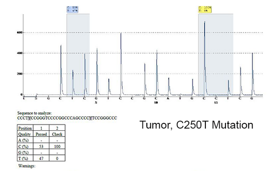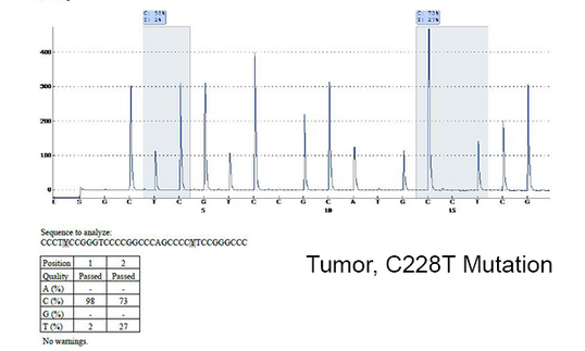 Das Telomerase-Reverse-Transkriptase-Gen (TERT) kodiert für die Reverse Transkriptase des Telomerase-Komplexes, welche für die Stabilität der Telomere (=Chromosomenenden) essenziell ist. Die TERT-Promotor-Mutationen C228T und C250T spielen eine signifikante Rolle in der malignen Transformation und Immortalisierung von Zellen und kommen häufig bei Glioblastomen und Oligodendrogliomen vor. Die Mutationen führen zu einer erhöhten mRNA-Transkription und damit zu einer Telomer-Elongation. Pyrosequencing der entsprechenden Region gibt Aufschluss über das Vorliegen der sich gegenseitig ausschließenden C228T- oder C250T-Mutationen [1, 2]. Formal ist das Vorliegen einer TERT Promoter Mutation allein ein Kriterium mit dem eine Astrozytom WHO Grad 3 zum Astrozytom WHO Grad 4 wird. Bei den Oligodendrogliomen hingegen geht eine TERT Promotor Mutation mit einer besseren Prognose einher.