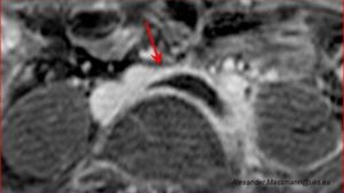 Die röntgenstrahlenfreie Magnetresonanztomografie (MRT) des Beckens zeigt die mit einem Pfeil markierte spitz zulaufende Thrombose (schwarze schnabelförmige Struktur) in der Beckenvene bedingt durch eine zugrundeliegende Beckenvenenkompression (May-Thurner).