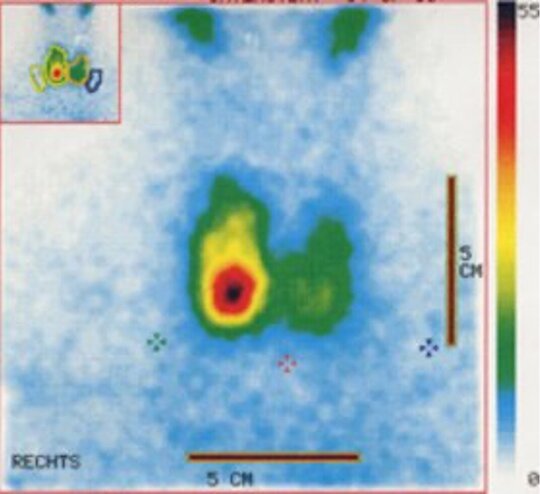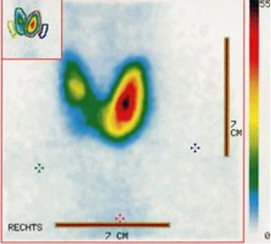 Die nuklearmedizinisch-szintigraphische Diagnose "heißer" Knoten bedeutet, dass der Knoten (zu-)viel Hormon produziert, er stellt sich in der Szintigraphie als mehrspeicherndes Areal dar.