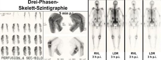 Möglich wird dies durch die Injektion eines schwach radioaktiven Medikaments in die Armvene, das vor allem von knochenbildenden Zellen aufgenommen wird. Dieses sendet Gamma-Strahlen aus, die wir mit einer modernen Gammakamera aufzeichnen. So können wir mit einem Computer bildlich das Knochensystem darstellen.