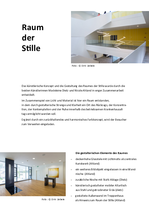 Der Raum der Stille bietet allen Besuchern einen Rückzugsort, um sich zu besinnen und Kraft zu schöpfen. Die künstlerische Ausstattung des Raums der Stille haben Madeleine Dietz, Bildhauerin aus Landau/Pfalz, und Nicole Ahland, Künstlerin aus Wiesbaden, übernommen. Madeleine Dietz hat aus Stahl und getrockneter Erde einen Tisch gestaltet, der bei Bedarf als mobiler Altartisch verwendet werden kann. Erde ist für die Künstlerin das Symbol für Werden und Vergehen, ein Schatz, den sie in einen Schrein aus Walzstahl geschichtet hat. Die Werke von Nicole Ahland – eine deckenhohe Glas-Stele und ein Wandbild aus Glas setzen unaufdringliche Akzente aus Licht und Farbe.