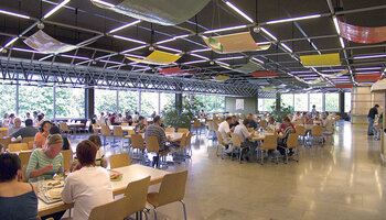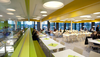 Mit 500 Sitzplätzen auf über 800 m² bieten wir unseren Mitarbeiterinnen und Mitarbeitern sowie Gästen täglich Speisen auf Restaurantniveau. Das Zentrum bildet unser kulinarischer Marktplatz mit verschiedenen Ausgabetheken, an welchen täglich bis zu 300 Hauptspeisen, Salate und Nachspeisen ausgegeben werden. Front Cooking, Themenwochen und Kooperationen mit Spitzenrestaurants aus der Region bereichern unser Angebot.