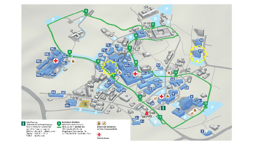 Innerhalb des Klinikums können Sie den kostenlosen Klinikbus benutzen. Der Bus fährt von 7:00 bis 16:00 Uhr im 15-Minuten-Takt. Der Bus fährt in 15 Minten einen Rundkurs durch das gesamte Gelände und hält dabei an 12 Haltestellen (siehe Lageplan).
