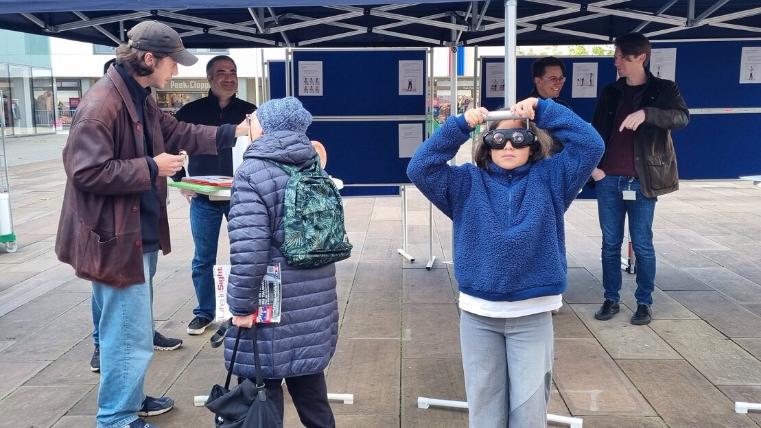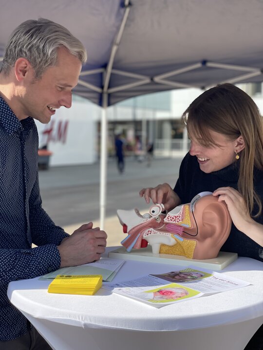 Informationsstände und Expertengespräche: An verschiedenen Ständen erhalten Besucherinnen und Besucher Broschüren und Informationsmaterial zu den Themen rund um die Sinnesorgane.